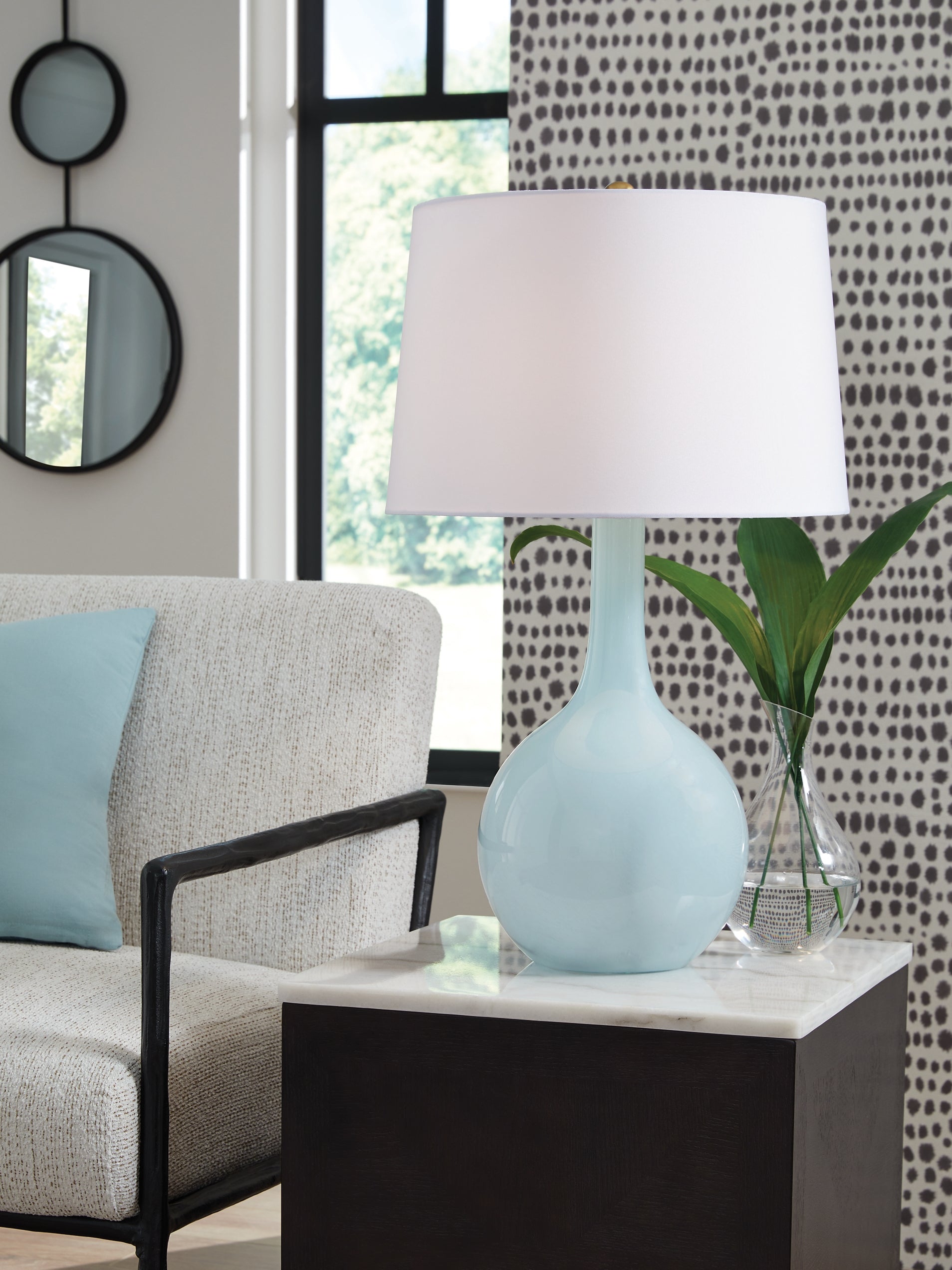 More than mere lighting, this spectacular table lamp illuminates your good taste. Its elegant silhouette, crafted from aqua blue glass, is contemporary artistry at its finest. No two lamps will be quite alike.